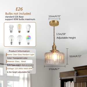 Glass Hanging Lights One-Light Vintage Pendant Light Fixtures with Clear Striped Glass Shade Mid Century Modern Gold Adjustable Cord Pendant Light for Living Room Dining Room Hallway